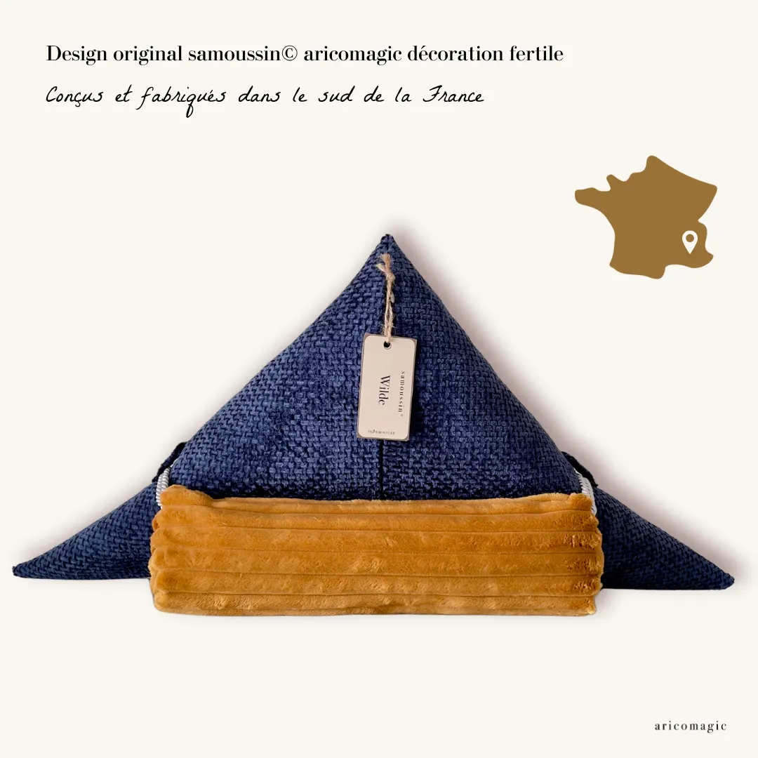 Wilde’s samoussin is a reading cushion entirely designed and made in France. It is composed of a triangle in houndstooth velvet and a base in Napoleon green upholstery.